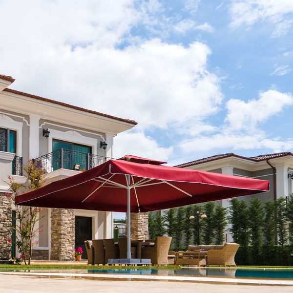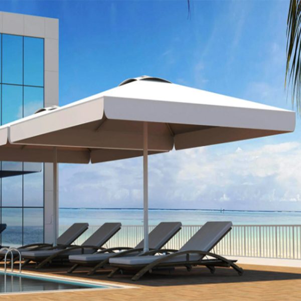 The mega umbrella is a practical and mobile model with an extensive coverage area. Mega umbrella is produced with a wide cross-section aluminum profile structure that is covered with acrylic fabric. You can easily open and close the system with a special telescopic gear mechanism manually. The mega umbrella mobile feature is provided by the wheel pulley with 4 marbles (each one is 45 kg). These weights provide strength under windy conditions to the mega umbrella. Mega umbrella mounting flange can be used to fix it to the ground by the kits.